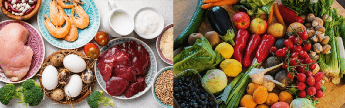 Pflanzliche Lebensmittel, Früchte, Gemüse, Kohl, Pilze, Beeren, Kräuter, Wildkräuter, Spinat, Rucola, Algen, Sprossen, getrocknetes Obst (ungeschwefelt), Mandeln.
